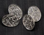 (ミアルカで購入).両面とも同じデザインとサイズで,繊細な彫金がなされている.大きさは18.6 mm×13.5 mmで8の字の金具でつながれてている.通常のシャツの袖のボタン孔を通すのには大きすぎるため8の字金具を外して自作の裏面を付けて使用.もちろん片方はオリジナルのまま保存している.